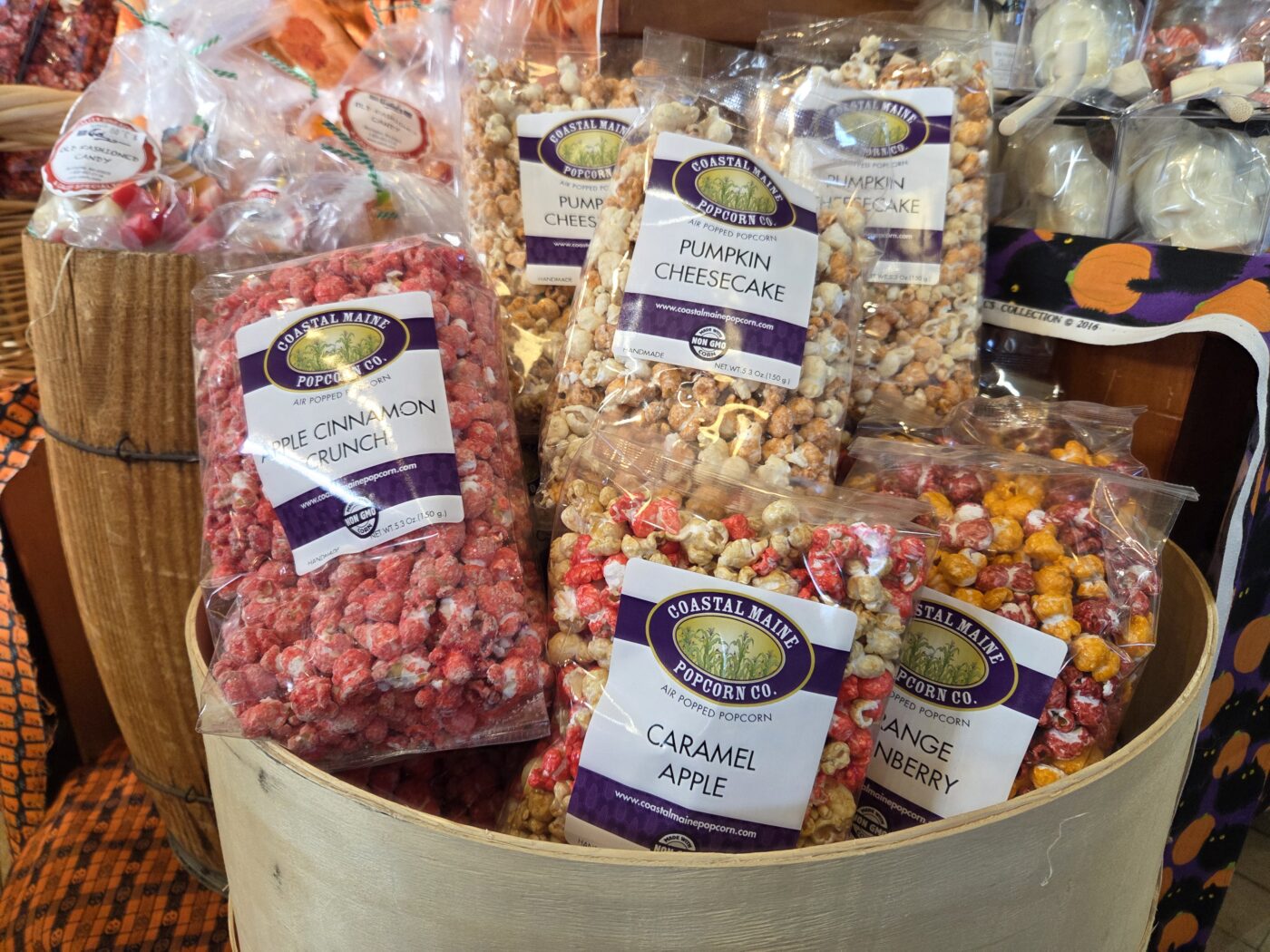 Fun fall inspired snacks are bountiful too. Just look at this Coastal Maine Popcorn Co. freshly popped corn! There is a reason this locally made popcorn flies off the shelves.